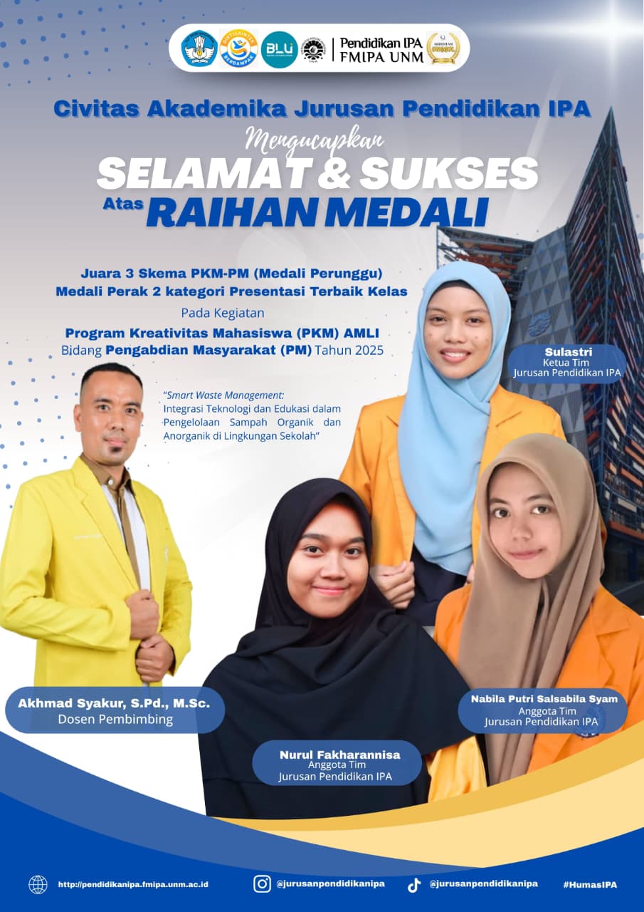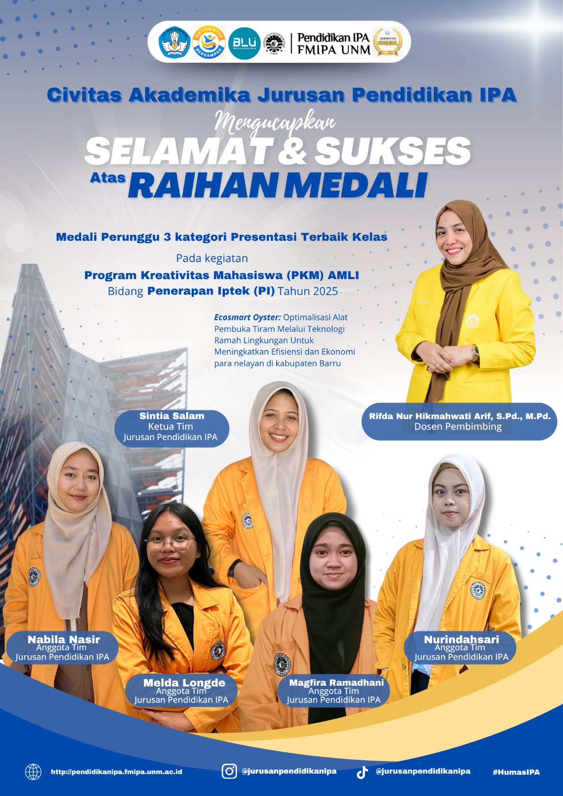 Raihan dua medali — perak dan perunggu di bidang pengabdian masyarakat, serta perunggu di bidang penerapan IPTEK — menegaskan komitmen Jurusan Pendidikan IPA FMIPA UNM dalam menumbuhkan budaya ilmiah, kreativitas, dan inovasi mahasiswa. Keberhasilan ini menjadi inspirasi bagi seluruh mahasiswa untuk terus berprestasi dan berperan aktif dalam pengembangan ilmu pengetahuan serta pemberdayaan masyarakat.