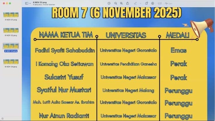 Tim “Smart Waste Management” tampil cemerlang dengan meraih Medali Perak untuk Kategori Presentasi Terbaik Kelas sekaligus Juara 3 (Medali Perunggu) dalam skema PKM-PM. Tim ini diketuai oleh Sulastri, bersama anggota Nurul Fakhrannisa dan Nabila Putri Salsabila Syam, dengan bimbingan Akhmad Syakur, S.Pd., M.Sc. Karya mereka berjudul “Smart Waste Management: Integrasi Teknologi dan Edukasi dalam Pengelolaan Sampah Organik dan Anorganik di Lingkungan Sekolah” menghadirkan sistem pengelolaan sampah berbasis teknologi sederhana dan pendekatan edukatif yang menumbuhkan kesadaran lingkungan di kalangan siswa sekaligus mendorong terciptanya budaya sekolah yang ramah lingkungan.