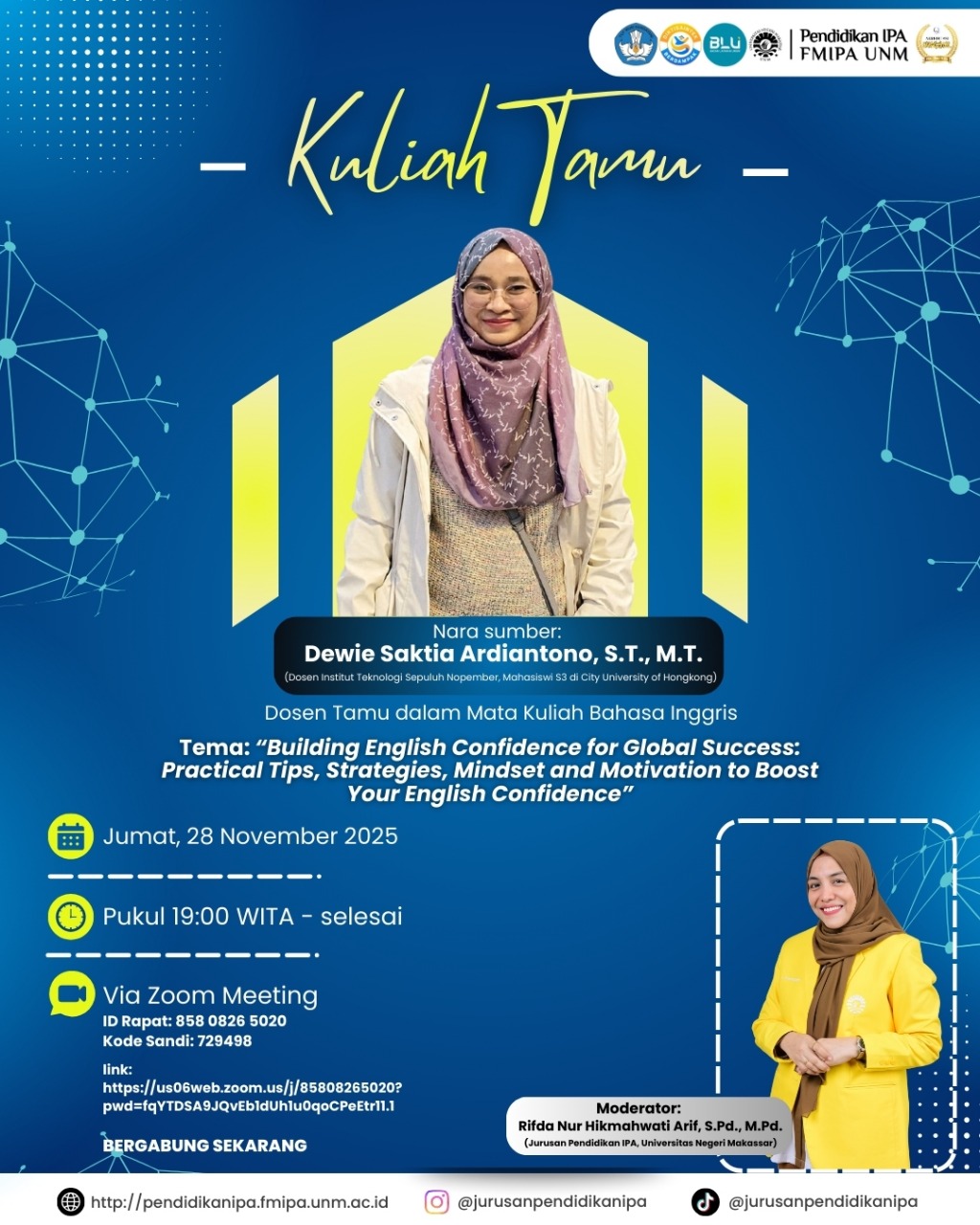 Makassar, 28 November 2025 — Jurusan Pendidikan IPA Fakultas Matematika dan Ilmu Pengetahuan Alam (FMIPA) Universitas Negeri Makassar (UNM) sukses menyelenggarakan kuliah tamu bertema “Building English Confidence for Global Success: Practical Tips, Strategies, Mindset and Motivation to Boost Your English Confidence” pada Jumat malam (28/11). Acara ini dilaksanakan secara daring melalui Zoom Meeting dan mendapatkan antusiasme tinggi dari mahasiswa.